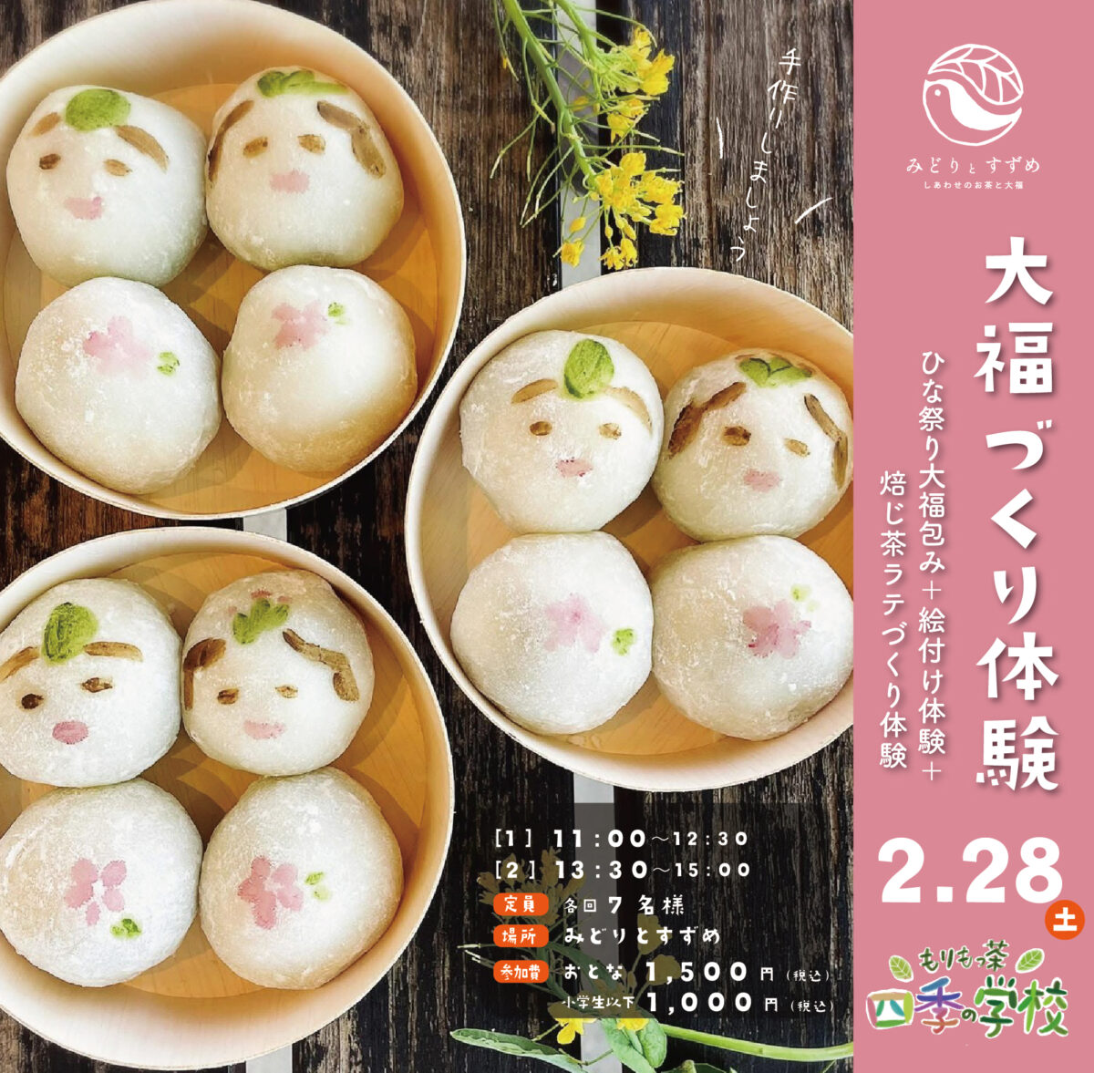 2月は【ひなまつり大福づくり講座と焙じ茶ラテづくり講座】になります。
