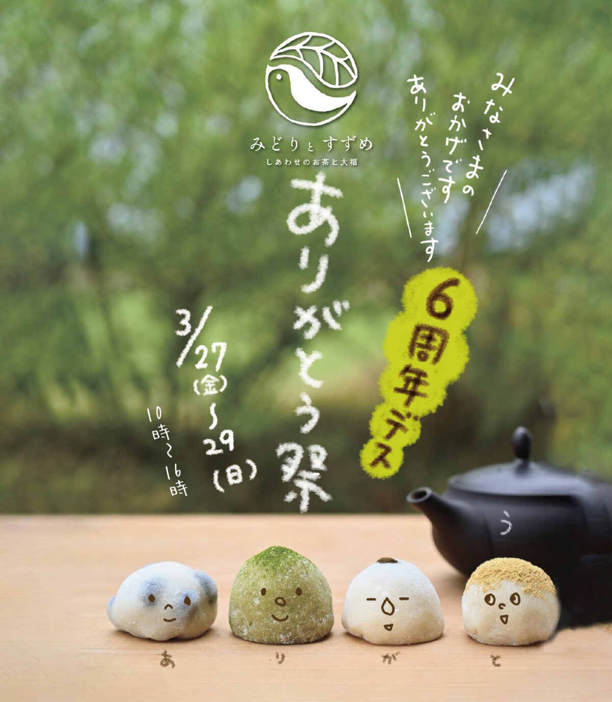 感謝の気持ちを込めて、3月27日(金)〜29日(日)は、6周年ありがとう祭を開催いたします。(10時〜16時※雨天決行)